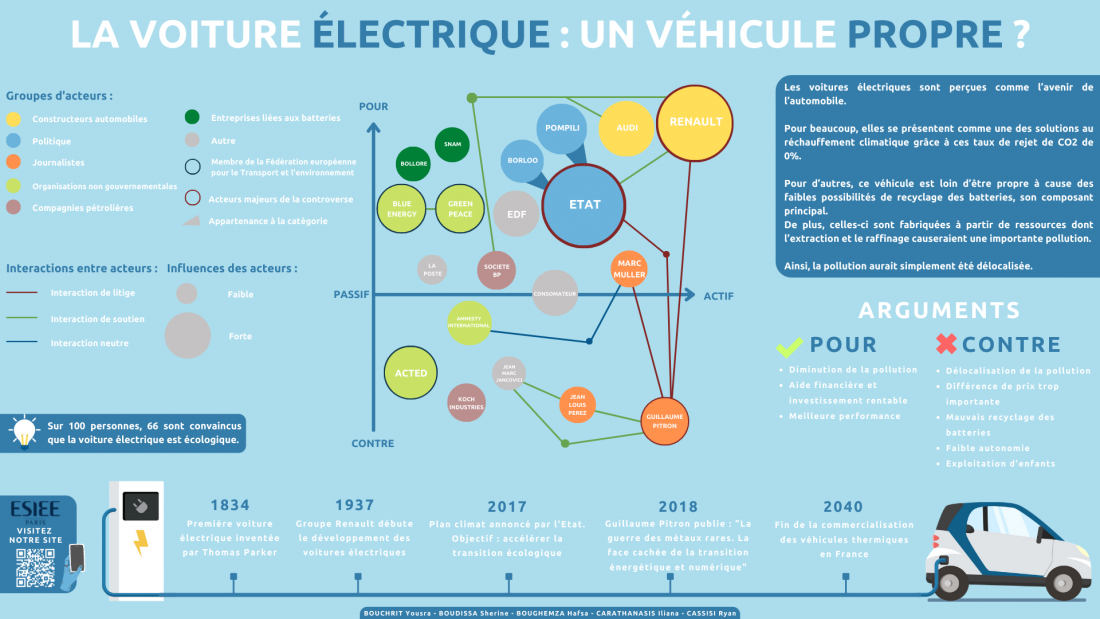 Description (introduction, enjeux...) : Malgré le développement des transports en commun, la voiture reste indispensable et pratique dans nos déplacements au quotidien. Cependant, ce moyen de transport émet d’importante quantité de Co2 néfaste pour l’environnement. C’est pourquoi les voitures électriques sont perçues comme l’avenir de l’automobile , parfois qualifiées de “relance verte” de ce secteur. Pour beaucoup, elles se présentent comme une des solutions au réchauffement climatique grâce à ses taux de rejets de CO2 de 0%. Pour d’autres, ce véhicule est encore loin d’être propre à cause des faibles possibilités de recyclage des batteries, son composant principal. De plus, celles-ci sont fabriquées à partir de ressources dont l’extraction et le raffinage causeraient d’importantes émissions de CO2. Ainsi, la pollution aurait simplement été délocalisée. La voiture électrique est-elle réellement propre, ou s’agit-il d’une manipulation marketing ?