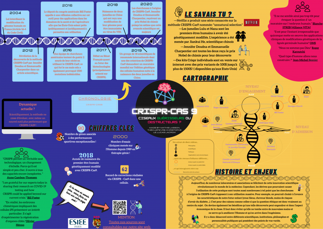 Description (introduction, enjeux...) : Aujourd'hui, de nombreux laboratoires et associations se félicitent de cette innovation scientifique révolutionnant le monde de la médecine. Cependant, les dérives que pourraient causer l’utilisation de cette pratique sont toutes aussi nombreuses à tel point que les chercheuses à l’origine de CRISPR-Cas9 s’opposent à son utilisation massive. Pour exemple, on pourrait choisir à l'avance les caractéristiques de notre futur enfant (yeux bleus, cheveux blonds, moins de risques d’avoir du diabète…). C'est pour des raisons comme celles-ci que la question éthique est donc vraiment au centre du sujet . On devine également les bénéfices qu’une telle découverte peut engendrer et donc l’aspect économique de la chose. Il faut donc éviter qu’elle ne tombe entre de mauvaises mains et ne serve qu’à améliorer l’Homme et qu’on arrive dans l’eugénisme. Il y a donc désaccord entre différents scientifiques, institutions, philosophes et personnalités publiques qui possèdent des points de vue variés.