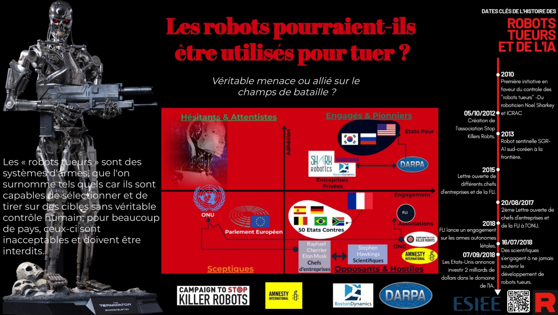 Description (introduction, enjeux...) : Doit-on interdire l'utilisation de "robots tueurs" dans le monde ? Ces armes de destructions capables de tirer sur des cibles sans contrôle humains soulève des questions d'éthiques et de morales.