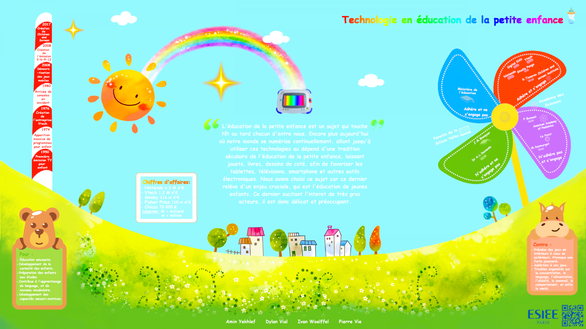 Description (introduction, enjeux...) : L'éducation de la petite enfance est un sujet qui touche tôt ou tard chacun d'entre nous. Encore plus aujourd'hui où notre monde se numérise continuellement, allant jusqu'à utiliser ces technologies au dépend d'une tradition séculaire de l'éducation de la petite enfance, laissant jouets, livres, dessins de coté, afin de favoriser les tablettes, télévisions, smartphone et autres outils électroniques. Nous avons choisi ce sujet car ce dernier relève d'un enjeu cruciale, qui est l'éducation de jeunes enfants. Ce dernier sucitant l'interet de très gros acteurs, il est donc délicat et préoccupant.