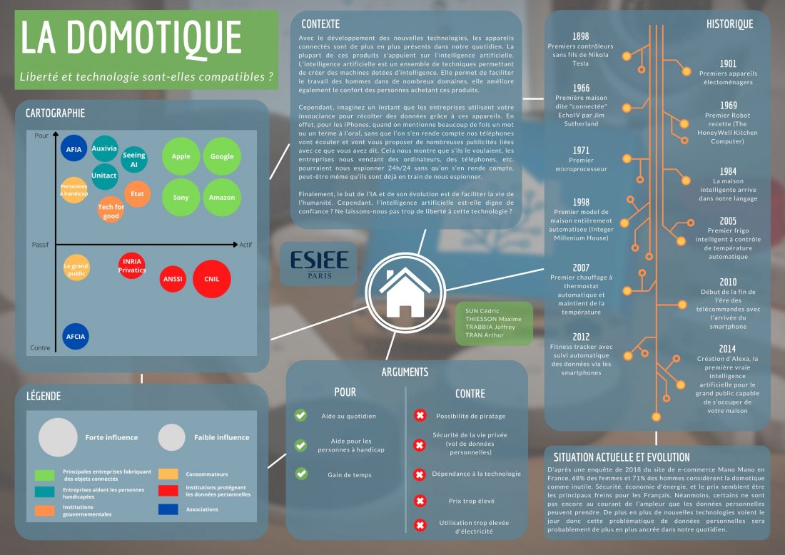 Description (introduction, enjeux...) : Avec le développement des nouvelles technologies, les appareils connectés sont de plus en plus présents dans notre quotidien. La plupart de ces produits s'appuient sur l’intelligence artificielle. L’intelligence artificielle est un ensemble de techniques permettant de créer des machines dotées d’intelligence. Elle permet de faciliter le travail des hommes dans de nombreux domaines, elle améliore également le confort des personnes achetant ces produits. L’intelligence artificielle est aussi présente dans la plupart de nos appareils électroniques sous différentes formes que ce soit Siri chez Apple ou Cortana chez Windows ces formes d’IA semblent innocentes mais imaginez un instant que les entreprises utilisent votre insouciance pour récolter des données. En effet, pour les iPhones, quand on mentionne beaucoup de fois un mot ou un terme à l’oral, sans que l’on s’en rende compte nos téléphones vont écouter et vont vous proposer de nombreuses publicités liées avec ce que vous avez dit. Cela nous montre que s’ils le voulaient les entreprises nous vendant des ordinateurs, des téléphones, etc. pourraient nous espionner 24h/24 sans qu’on s’en rende compte, peut-être même qu’ils sont déjà en train de nous espionner. Finalement, le but de l’IA et de son évolution est de faciliter la vie de l’humanité. Cependant, l’intelligence artificielle est-elle digne de confiance ? Ne laissons-nous pas trop de liberté à cette technologie ? Certaines personnes sont réticentes à propos de l’intelligence artificielle et ont peur que ces machines dotées d’intelligence deviennent trop intelligentes et prennent le dessus sur les humains.