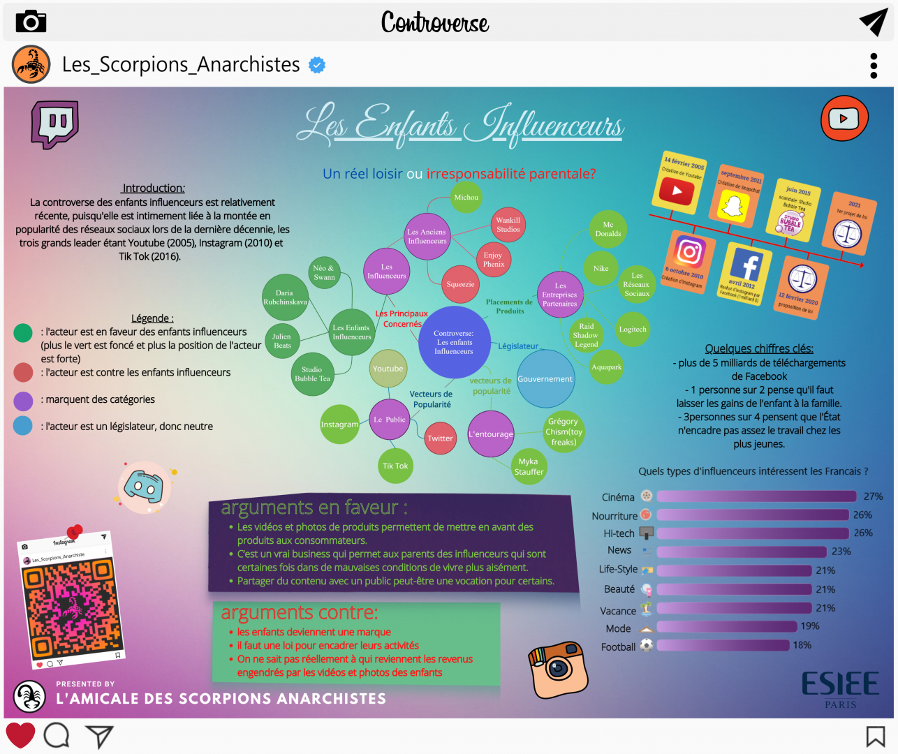 Description (introduction, enjeux...) : La controverse des enfants influenceurs est relativement récente, puisqu'elle est intimement liée à la montée en popularité des réseaux sociaux lors de la dernière décennie, les trois grands leader étant Youtube (2005), Instagram (2010) et Tik Tok (2016). On peut se demander si le métier d'influenceur est un réel métier, si l'état à une position sur le sujet, si exposer les enfants aux réseaux sociaux a cet age est une bonne chose ou au contraire si ca ne serait pas malsain.