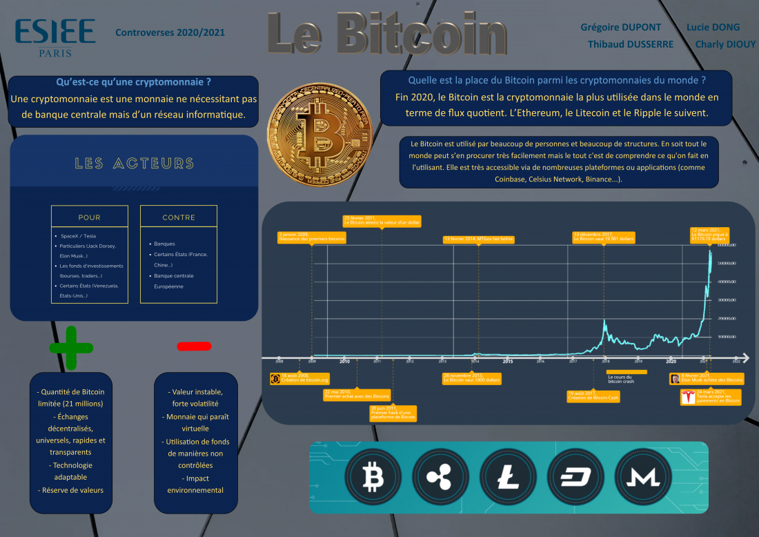 Description (introduction, enjeux...) : Certains voient dans cette monnaie virtuelle une véritable révolution des transactions, tandis que d'autres s'en méfient ouvertement. Une crypto-monnaie c'est une monnaie virtuelle, qui ne dépend pas d'un État, d'un gouvernement, d'une banque, etc... mais qui repose sur l'ensemble de ses utilisateurs. C'est une monnaie électronique utilisable sur un réseau informatique. À l’inverse de l’Euro, le Yen ou le Dollar qui sont des monnaies “physiques”, le Bitcoin pour reprendre son exemple, est une monnaie “virtuelle”. C’est une controverse parce qu' il y a pas mal d’acteurs sur les avantages et inconvénients niveau mondial.