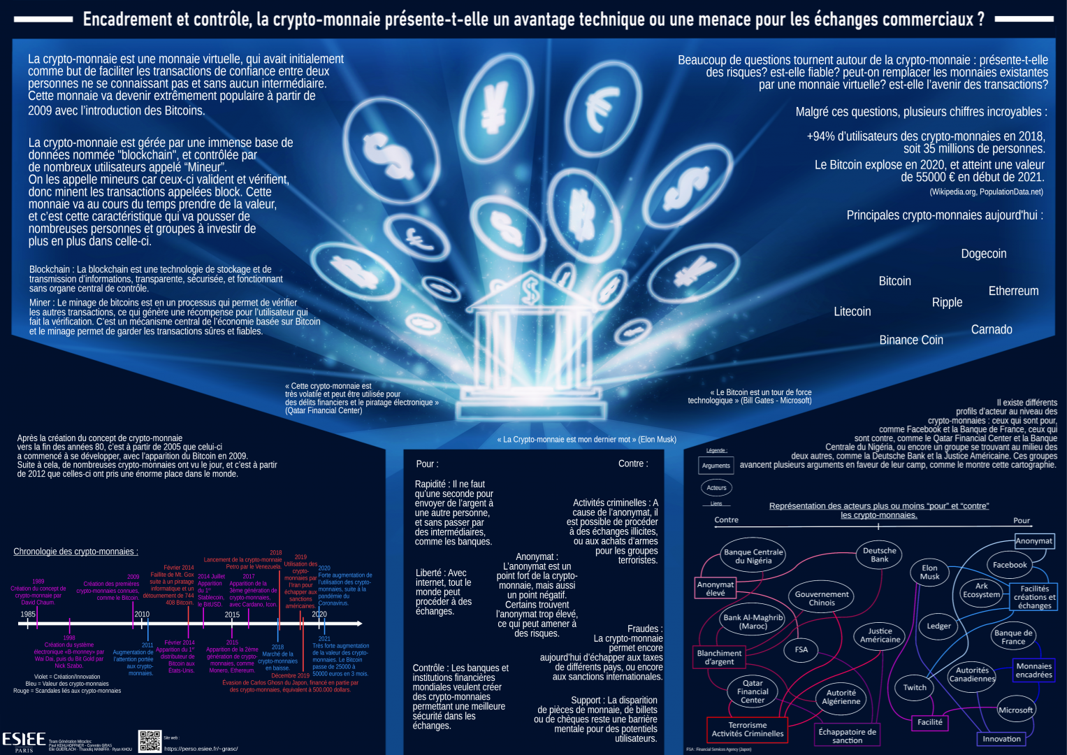 Description (introduction, enjeux...) : La crypto-monnaie est une monnaie virtuelle qui avait initialement comme but de faciliter les transactions de confiance entre deux personnes ne se connaissant pas et sans aucun intermédiaire, va devenir extrêmement populaire en 2009 avec l’introduction des Bitcoins. Mais comment marche-t-elle ? Est-elle fiable ? Pourra-t-elle remplacer les monnaies physiques actuelles ?