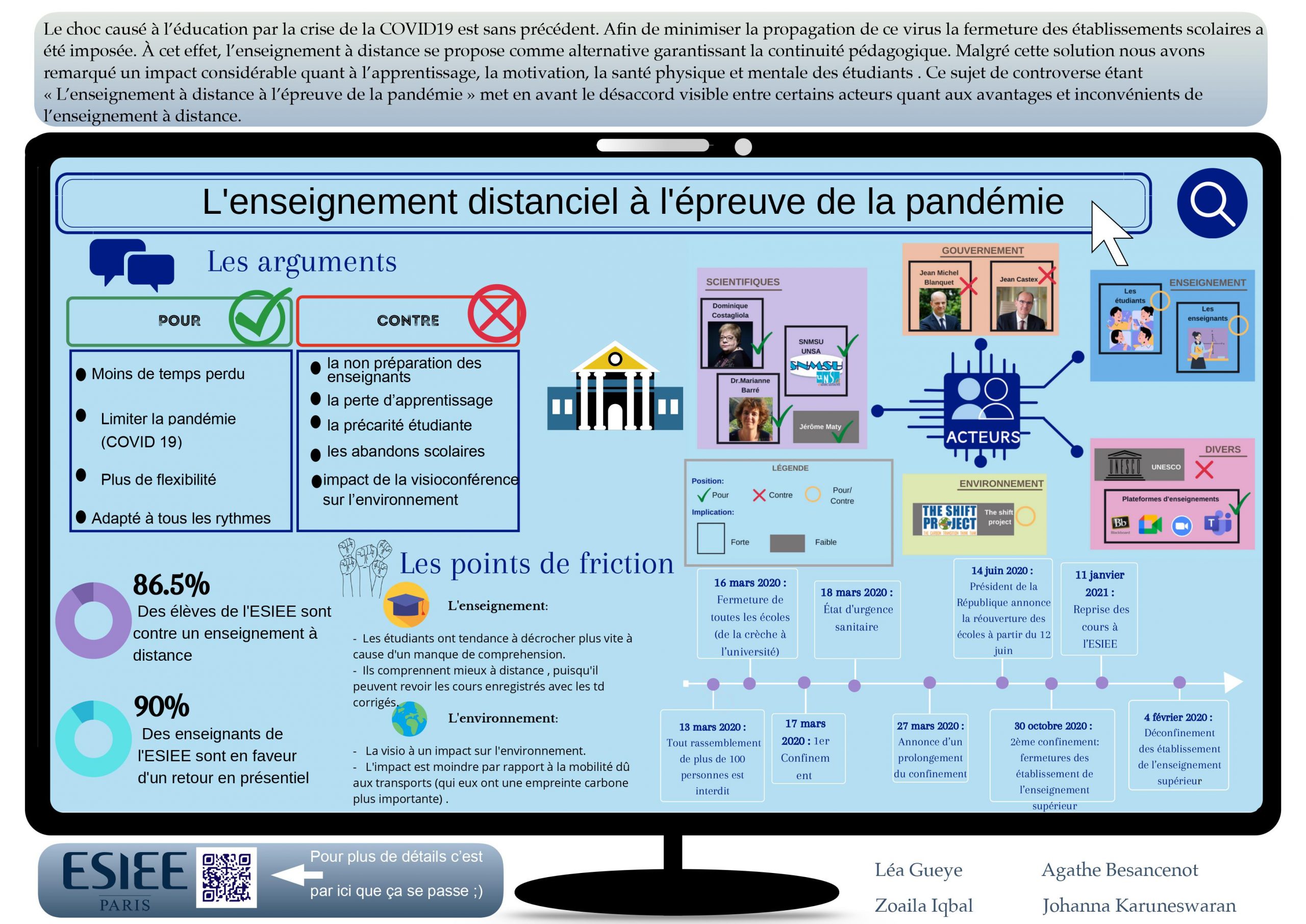 Description (introduction, enjeux...) : Le choc causé à l’éducation par la crise de la COVID19 est sans précédent. Afin de minimiser la propagation de ce virus la fermeture des établissements scolaires a été imposée. À cet effet, l’enseignement à distance se propose comme alternative garantissant la continuité pédagogique. Malgré cette solution nous avons remarqué un impact considérable quant à l’apprentissage, la motivation, la santé physique et mentale des étudiants . Ce sujet de controverse étant « L’enseignement à distance à l’épreuve de la pandémie » met en avant le désaccord visible entre certains acteurs quant aux avantages et inconvénients de l’enseignement à distance.