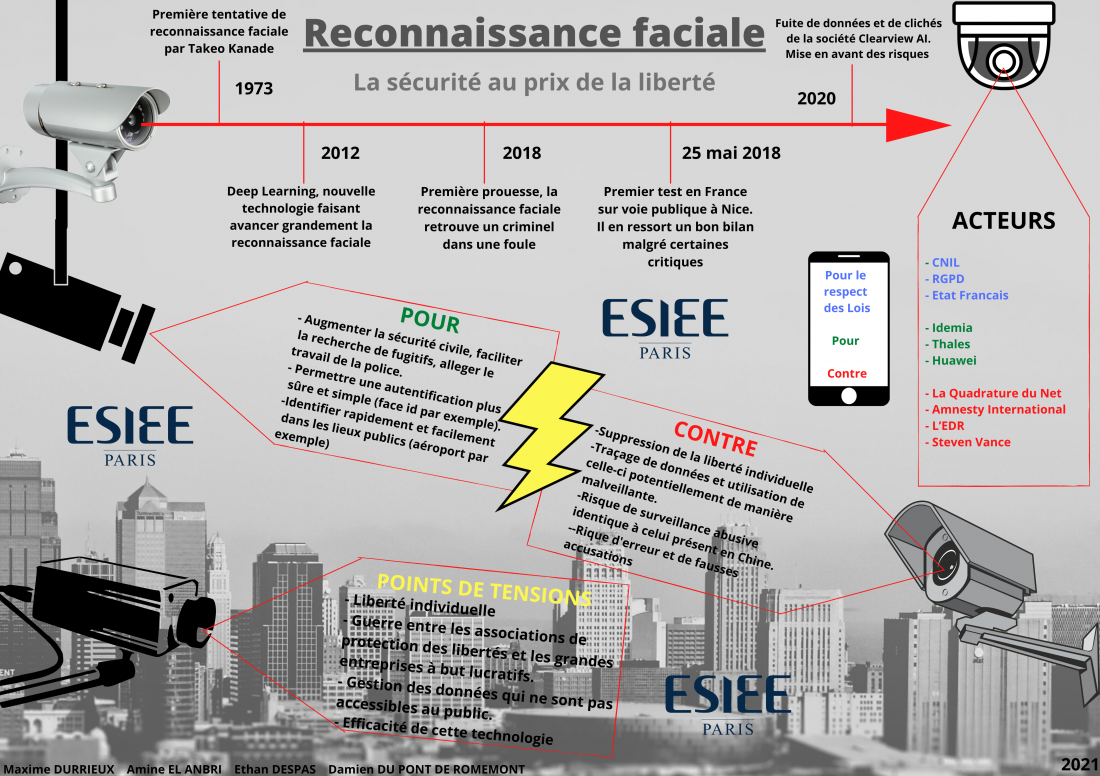 Description (introduction, enjeux...) : Controverse très large au vu du grand nombre d’acteurs qui prônent les bons et les mauvais côtés de ces nouvelles technologies. De plus, cette controverse se développe parallèlement aux avancées technologiques dans le domaine de la reconnaissance faciale. Autrement dit, c’est un débat qui se place de plus en plus au devant de la scène et qui n’a pas encore d’issue définitive. C’est avant tout une controverse qui porte sur la population actuelle avec des enjeux basés sur la liberté et la sécurité des citoyens.