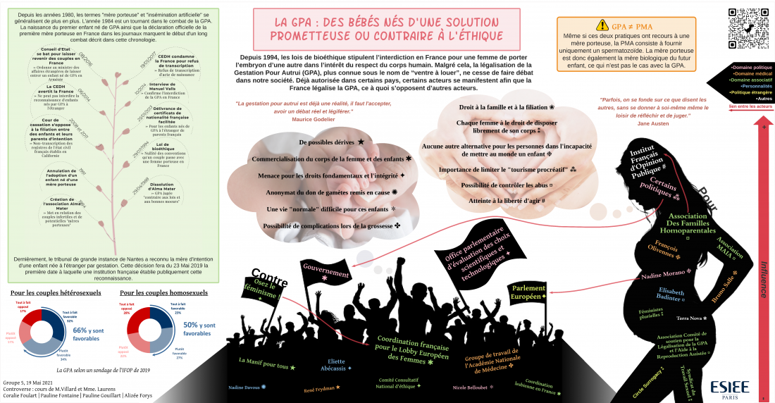 Description (introduction, enjeux...) : La Gestation Pour Autrui est une pratique médicale développée dans le but de rendre possible à un couple infertile d’avoir un enfant. En raison de son élargissement à d’autres cas, des questions de bioéthique mettant principalement en jeu la santé et le droit de la femme se posent. Faudrait-il atteindre l’égalité de reproduction au dépit d’une exploitation du corps de la femme ? Mettre fin au tourisme procréatif légitimerait-il les troubles psychologiques que pourraient subir de nouvelles mères porteuses ? La légalisation du processus de procréation peut-elle avoir lieu malgré les nombreux acteurs qui s’y opposent ? Cette pratique maintenant controversée divise la population entre ses partisans d’un côté et ses protestants de l’autre. C’est pourquoi nous nous attardons sur cette solution prometteuse ou bien contraire à l’éthique qu’est la GPA.