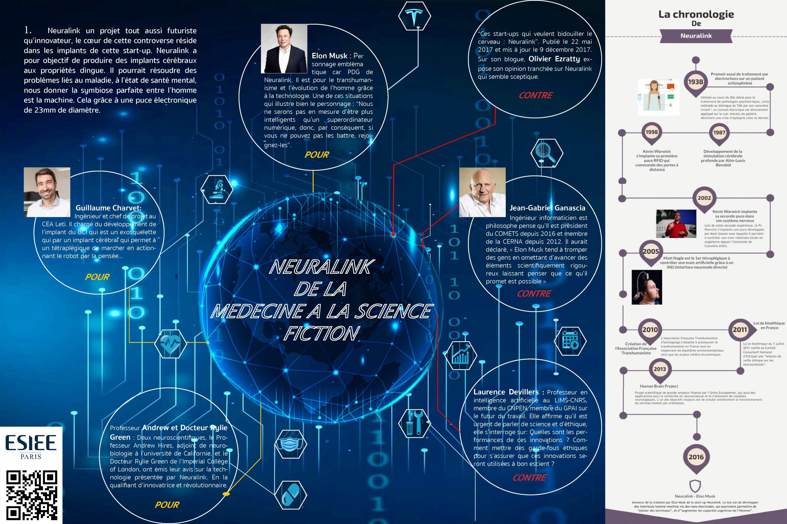 Description (introduction, enjeux...) : Neuralink un projet tout aussi futuriste que innovateur, le cœur de cette controverse réside dans les implants de cette start-up. Neuralink à pour objectif de produire des implants cérébraux aux propriétés dingue. Il pourrait résoudre des problèmes liés au maladie, à l’état de santé mental, nous donner la symbiose parfaite en l’homme est la machine, principal souhait du PDG dont on reparlera plus tard Elon Musk. Cependant tous ne partage pas cette vision des choses qu’il qualifie d'utopique, il émet des doutes tout aussi bien technique et éthique. Dans cette controverse, nous allons nous centrer sur ce point, des désaccord au sujet de ces implants et cela sur différent aspect qui ont tous leur importances en vu des objectif de l’entreprise. Rappelons tout de même que les personnes en jeu quand cette controverses sous des personnes avec de forte qualification dans leur domaines. Ce sujet est d’actualité, ce qui le rend d’autant plus passionnant vu que les débats se poursuivent à l’heure ou nous faisons nos recherches.