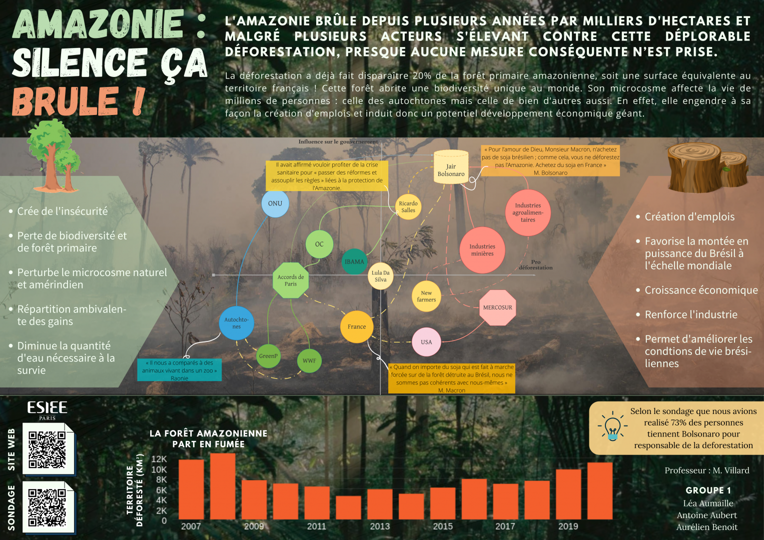 Description (introduction, enjeux...) : L'Amazonie brûle depuis plusieurs années par milliers d'hectares et malgré plusieurs acteurs s'élevant contre cette déplorable déforestation, presque aucune mesure conséquente n’est prise. La déforestation a déjà fait disparaître 20% de la forêt primaire amazonienne, soit une surface équivalente au territoire français ! Cette forêt abrite une biodiversité unique au monde. Son microcosme affecte la vie de millions de personnes : celle des autochtones mais celle de bien d'autres aussi. En effet, elle engendre à sa façon la création d'emplois et induit donc un potentiel développement économique géant.